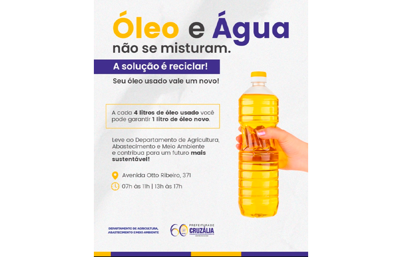 A Prefeitura de Cruzália, por meio do Departamento de Agricultura, Abastecimento e Meio Ambiente, está promovendo uma campanha de conscientização sobre o descarte correto do óleo de cozinha utilizado. A iniciativa incentiva a população a levar o resíduo até o ponto de coleta e, a cada 4 litros de óleo usado, o cidadão recebe 1 litro de óleo novo em troca.