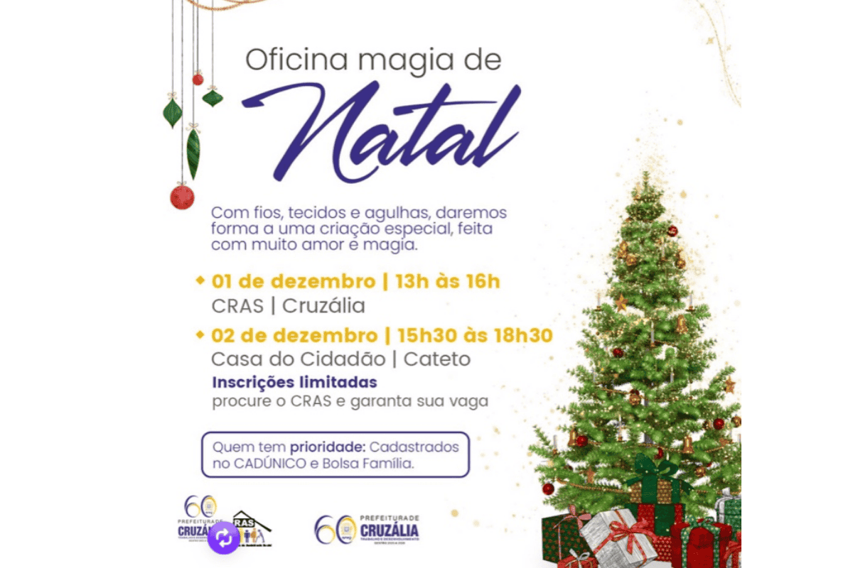 O CRAS de Cruzália vai oferecer a Oficina Magia de Natal nos dias 1º e 2 de dezembro, com atividades gratuitas voltadas à criatividade, ao artesanato e ao fortalecimento do espírito comunitário. As inscrições são limitadas e devem ser feitas diretamente no CRAS.