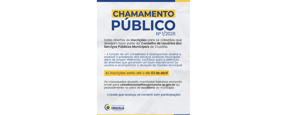 A Prefeitura de Cruzália abriu chamamento público nº 1/2026 para selecionar moradores interessados em integrar o Conselho de Usuários dos Serviços Públicos Municipais. As inscrições estão abertas até 3 de abril.