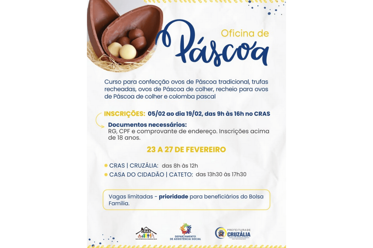 A Prefeitura de Cruzália abriu inscrições para a Oficina de Páscoa, curso gratuito voltado à capacitação de moradores interessados na produção artesanal de chocolates e produtos típicos do período pascal. A iniciativa oferece aulas práticas de confecção de ovos de Páscoa tradicionais, trufas recheadas, ovos de colher, recheios e colomba pascal, com foco na qualificação profissional e na geração de renda.