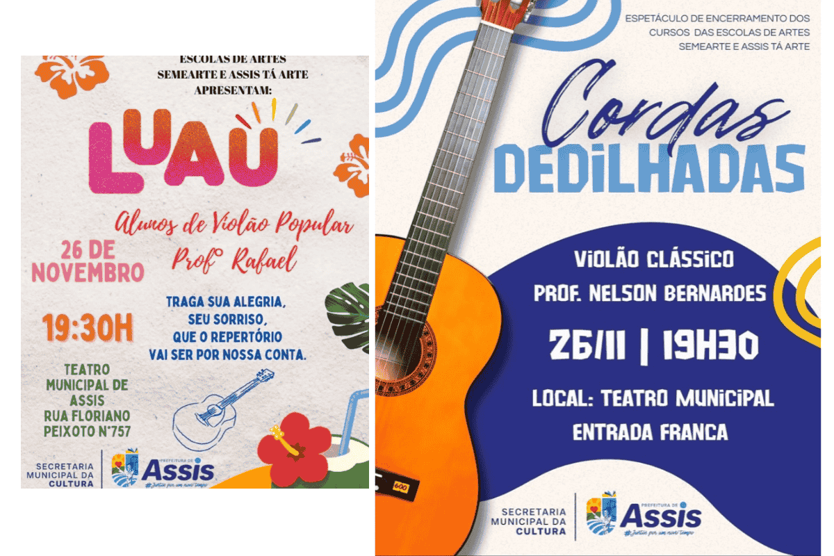 A Secretaria Municipal de Cultura de Assis realiza nesta quarta-feira, 26 de novembro, às 19h30, uma noite dupla de apresentações musicais no Teatro Municipal, reunindo repertórios de violão clássico e popular. O evento tem entrada franca e integra o encerramento das atividades das escolas de artes SemeArte e Assis Tá Arte.