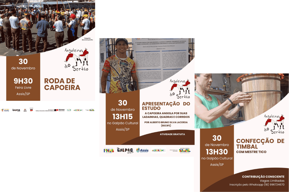 Às 13h15, no Galpão Cultural, ocorre a apresentação do estudo “A capoeira angola por suas ladainhas, quadras e corridos”, conduzida por Alberto Bruno Silva Lacerda, pesquisador de Recife. O trabalho analisa aspectos históricos, simbólicos e contemporâneos da tradição da capoeira, valorizando sua dimensão cultural e educativa.