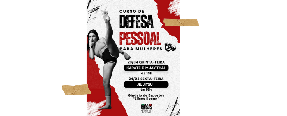 A Prefeitura de Pedrinhas Paulista realiza, a partir desta quinta-feira (23), um curso de defesa pessoal voltado exclusivamente para mulheres. A programação começa hoje, às 19h, no Ginásio de Esportes “Eliseo Rosan”, e segue também nesta sexta-feira (24), no mesmo horário e local.