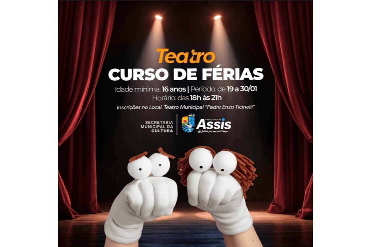 A Prefeitura de Assis, por meio da Secretaria Municipal de Cultura, está com inscrições abertas para o Curso de Férias de Teatro, voltado a jovens a partir de 16 anos. A atividade acontece entre os dias 19 e 30 de janeiro de 2026, no Teatro Municipal Padre Enzo Ticinelli, com aulas no período noturno, das 18h às 21h.