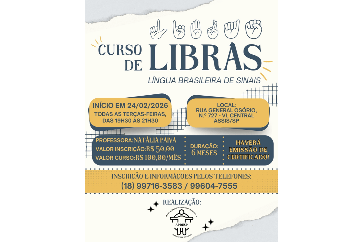 A APDESP abriu inscrições para uma nova turma do curso de Libras, a Língua Brasileira de Sinais, que terá início no dia 24 de fevereiro de 2026, em Assis. As aulas acontecem sempre às terças-feiras, das 19h30 às 21h30, na Rua General Osório, número 727, na Vila Central.