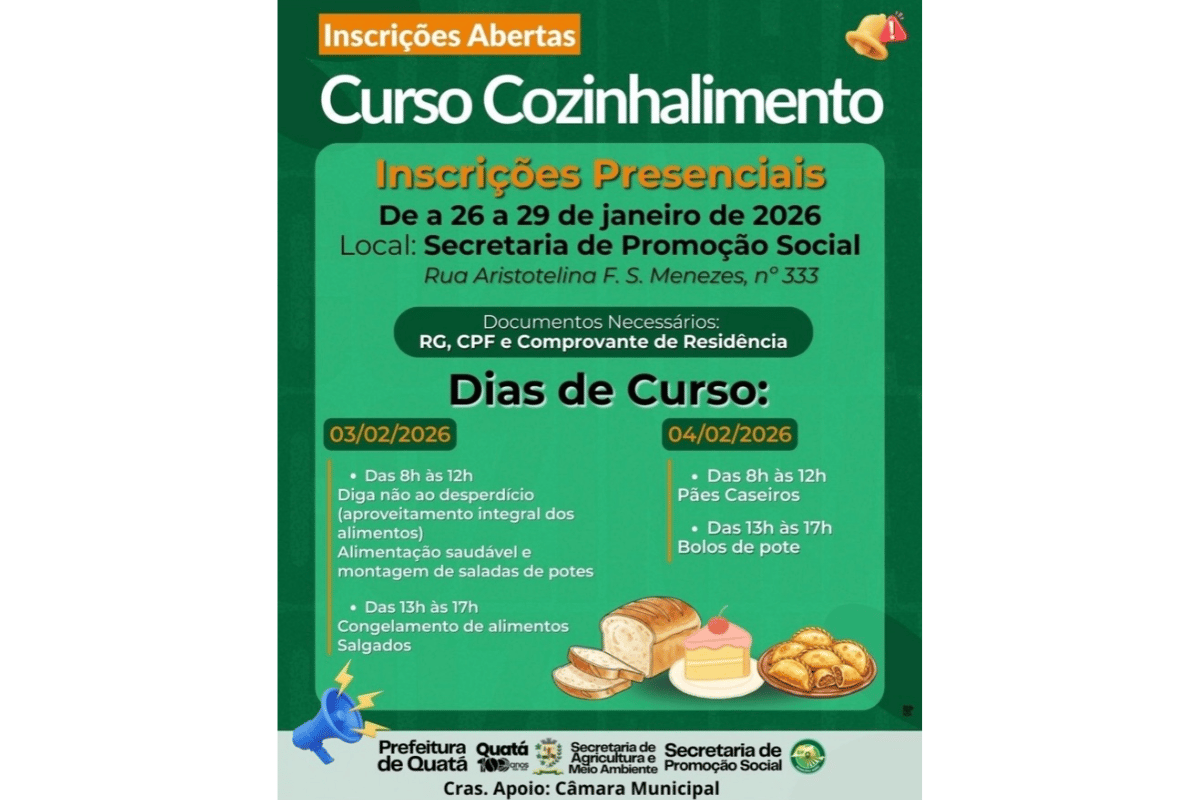 A Prefeitura de Quatá está com inscrições abertas até esta quinta-feira (29 de janeiro) para o Curso de Cozinhalimento, voltado à capacitação em alimentação saudável, aproveitamento integral dos alimentos e técnicas práticas de preparo. As inscrições são presenciais e devem ser feitas na Secretaria de Promoção Social.