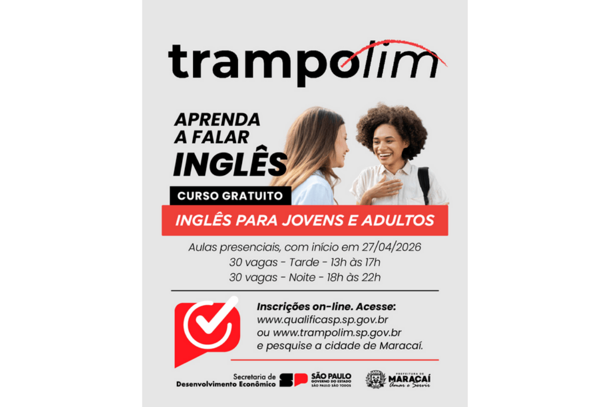 Moradores de Maracaí têm uma nova oportunidade de qualificação profissional com a abertura de inscrições para um curso gratuito de inglês voltado a jovens e adultos. As aulas serão presenciais e têm início previsto para o dia 27 de abril de 2026.