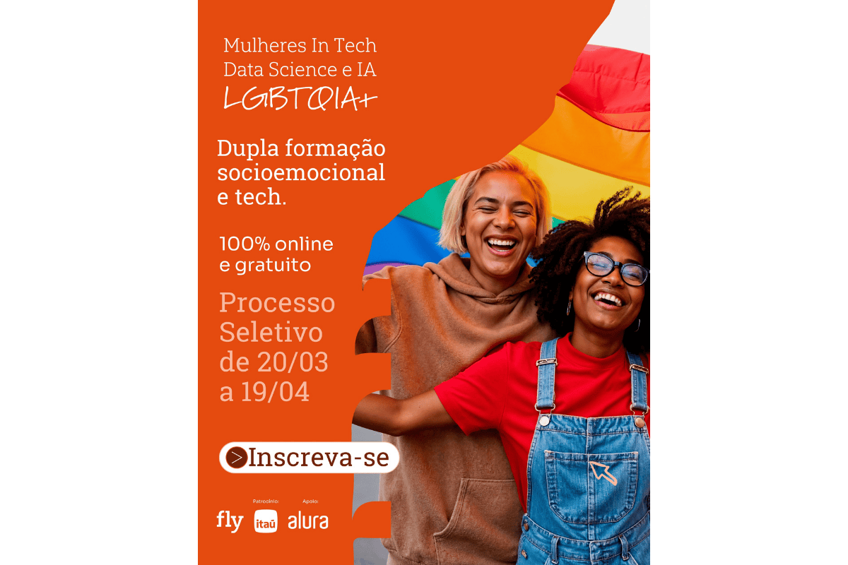A Fly Educação, em parceria com o Banco Itaú, abriu inscrições para um curso gratuito de formação em Data Science e Inteligência Artificial voltado a mulheres (cis ou trans) e pessoas não binárias da comunidade LGBTQIAPN+ residentes na cidade de São Paulo. Ao todo, são 30 vagas disponíveis.
