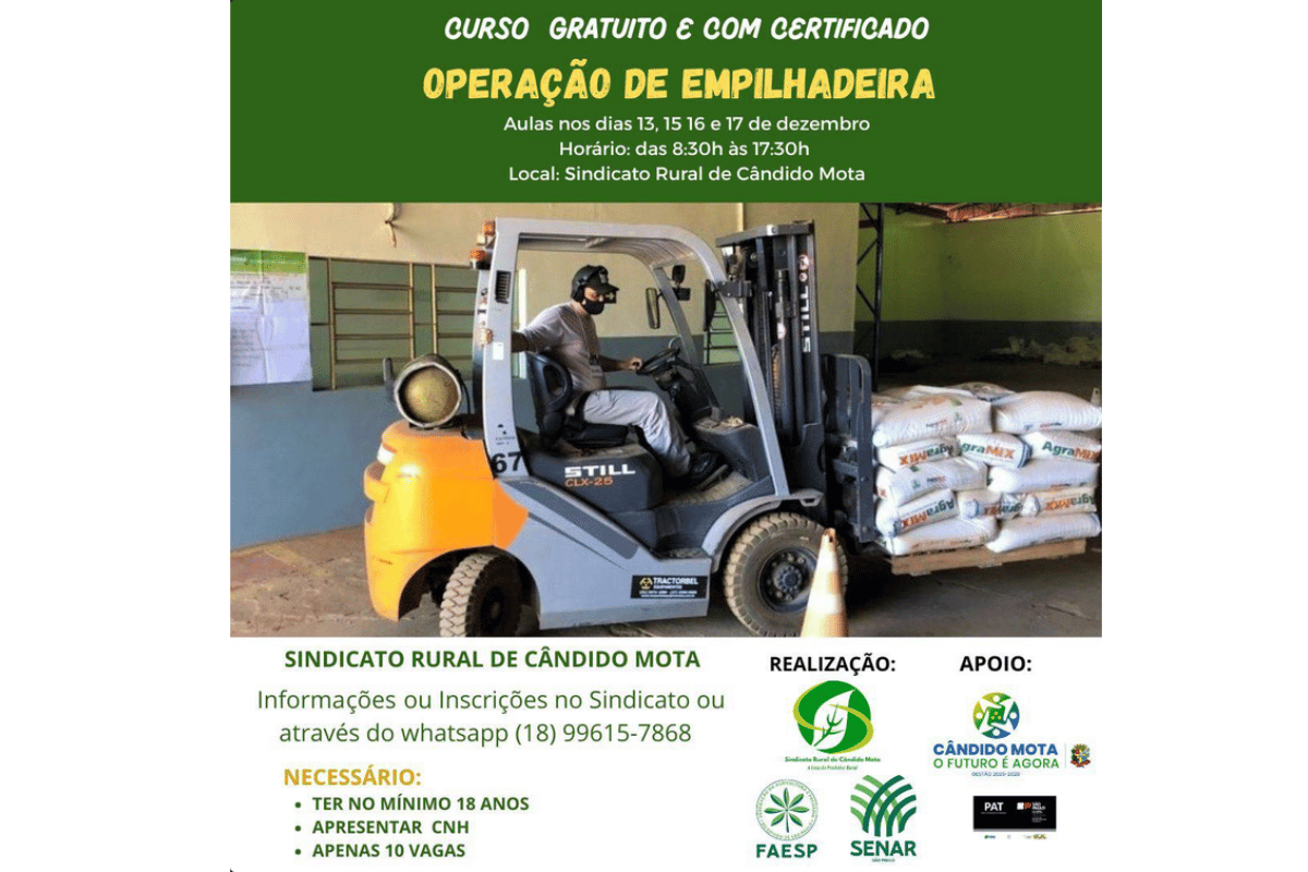 O Sindicato Rural de Cândido Mota está com inscrições abertas para o curso gratuito de Operação de Empilhadeira, uma capacitação voltada a jovens e adultos que desejam ampliar a qualificação profissional e aumentar as chances de inserção no mercado de trabalho. As aulas serão realizadas nos dias 13, 15, 16 e 17 de dezembro, das 8h30 às 17h30, com certificação ao final.