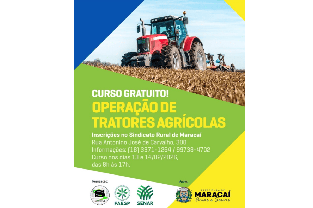A Prefeitura de Maracaí abriu inscrições para o curso gratuito de Operação de Tratores Agrícolas, iniciativa voltada à qualificação de trabalhadores e interessados em atuar no setor agropecuário. A capacitação será realizada nos dias 13 e 14 de fevereiro de 2026, das 8h às 17h, com inscrições presenciais no Sindicato Rural de Maracaí.