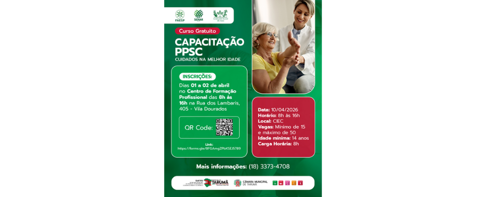 A Prefeitura de Tarumã abre nesta quarta-feira, 1º de abril, as inscrições para o curso gratuito de Capacitação PPSC - Cuidados na Melhor Idade. Os interessados também poderão se inscrever na quinta-feira, 2 de abril, das 8h às 16h, no Centro de Formação Profissional, localizado na Rua dos Lambaris, 405, na Vila Dourados.