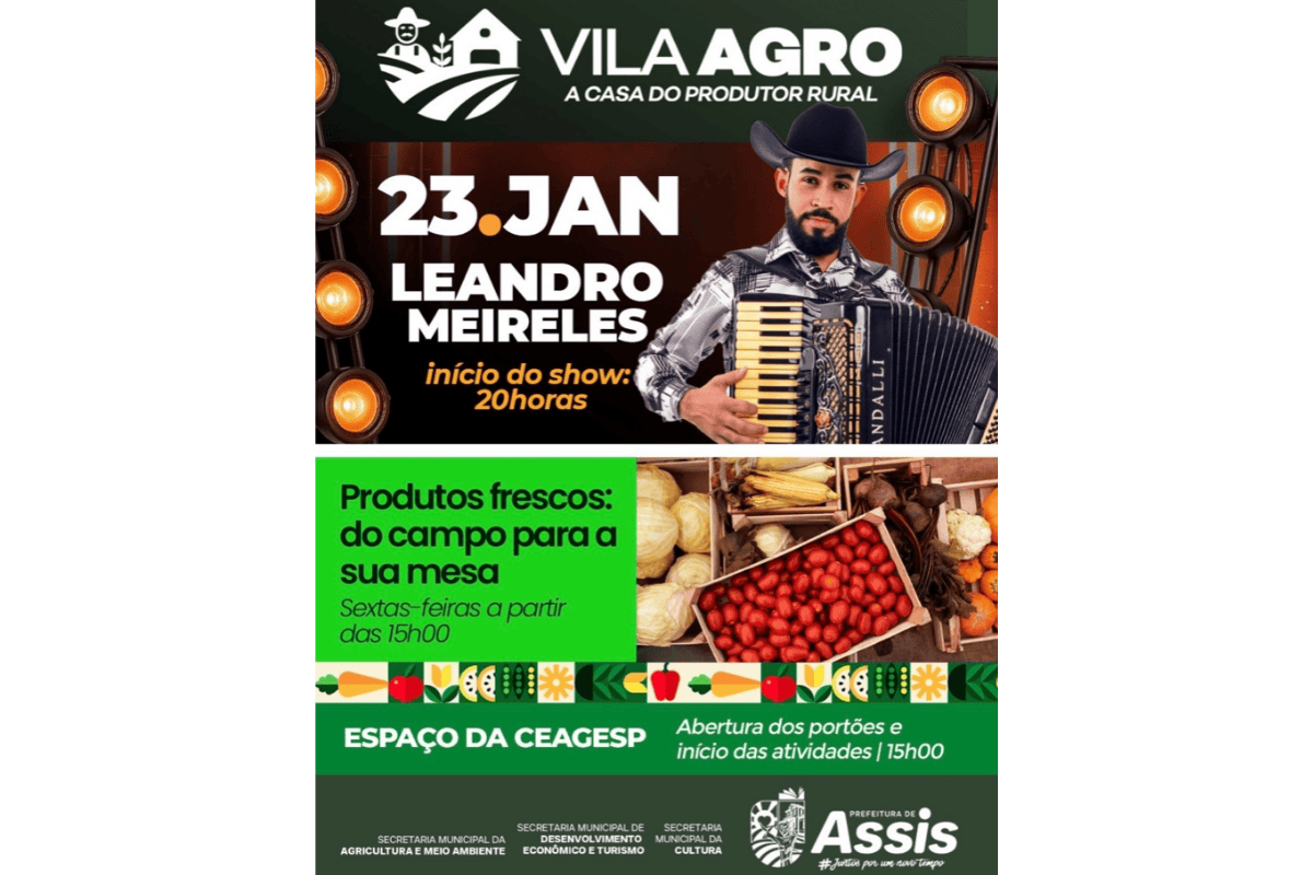 A cidade de Assis recebe nesta sexta-feira, 23 de janeiro de 2026, mais uma edição da Vila Agro, iniciativa que conecta produtores rurais, consumidores urbanos e atrações culturais em um mesmo espaço. A programação começa a partir das 15h, no espaço da Ceagesp, com abertura dos portões e início das atividades voltadas ao comércio de produtos frescos e ao lazer da população.