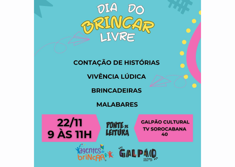 O Galpão Cultural de Assis recebe neste sábado, 22 de novembro, das 9h às 11h, uma edição do Dia do Brincar Livre, atividade aberta ao público que incentiva o desenvolvimento criativo das crianças e a ocupação comunitária do espaço.