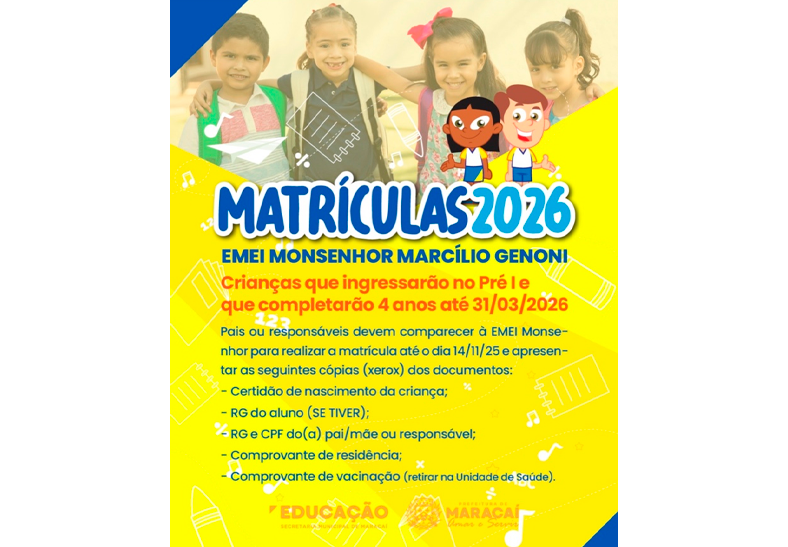 A Prefeitura de Maracaí, por meio da Secretaria Municipal de Educação, informa que estão abertas as matrículas para o ano letivo de 2026 na EMEI Monsenhor Marcílio Genoni. O processo é voltado às crianças que ingressarão no Pré I e que completarão 4 anos até 31 de março de 2026.