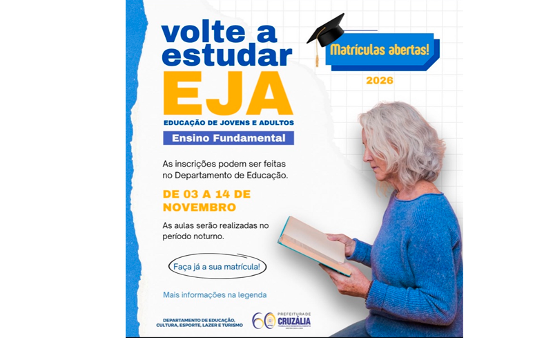 O Departamento Municipal de Educação de Cruzália informa que estão abertas, até o dia 14 de novembro, as inscrições para o programa EJA – Educação de Jovens e Adultos, voltado à conclusão do Ensino Fundamental.