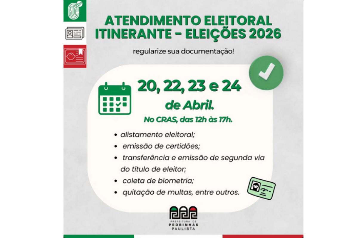 Eleitores de Pedrinhas Paulista terão acesso a serviços da Justiça Eleitoral entre os dias 20, 22, 23 e 24 de abril, por meio de atendimento itinerante promovido pelo Tribunal Regional Eleitoral de São Paulo (TRE-SP), em parceria com a Prefeitura. A ação será realizada no Centro de Referência em Assistência Social (CRAS), localizado na Rua do Trabalho, 676, das 12h às 17h.