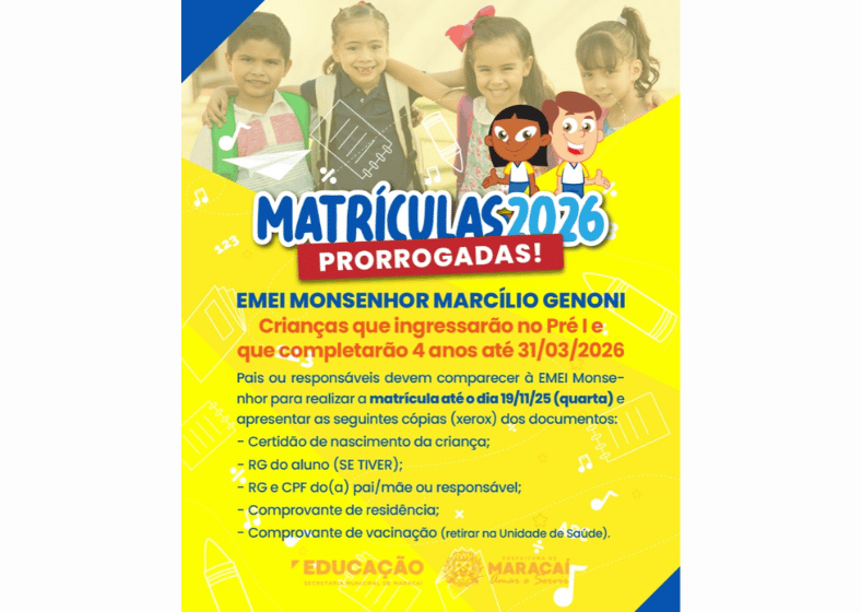 A Prefeitura de Maracaí informou a prorrogação do prazo de matrículas para o Pré I da EMEI Monsenhor Marcílio Genoni. Podem se inscrever as crianças que completarão 4 anos até 31 de março de 2026. O novo prazo vai até quarta-feira, 19 de novembro de 2025, diretamente na unidade escolar.