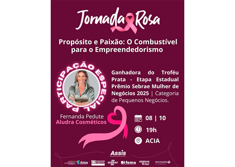 A Jornada Rosa é uma iniciativa da Secretaria Municipal de Desenvolvimento Econômico, por meio da Prefeitura de Assis, em parceria com o SEBRAE, SEBRAE Aqui Assis, ACIA, SINCOVAMA e FEMA, e integra as ações do Programa Assis Empreendedora. A participação é gratuita, e as inscrições estão abertas até esta terça-feira, dia 7 de outubro, neste link.