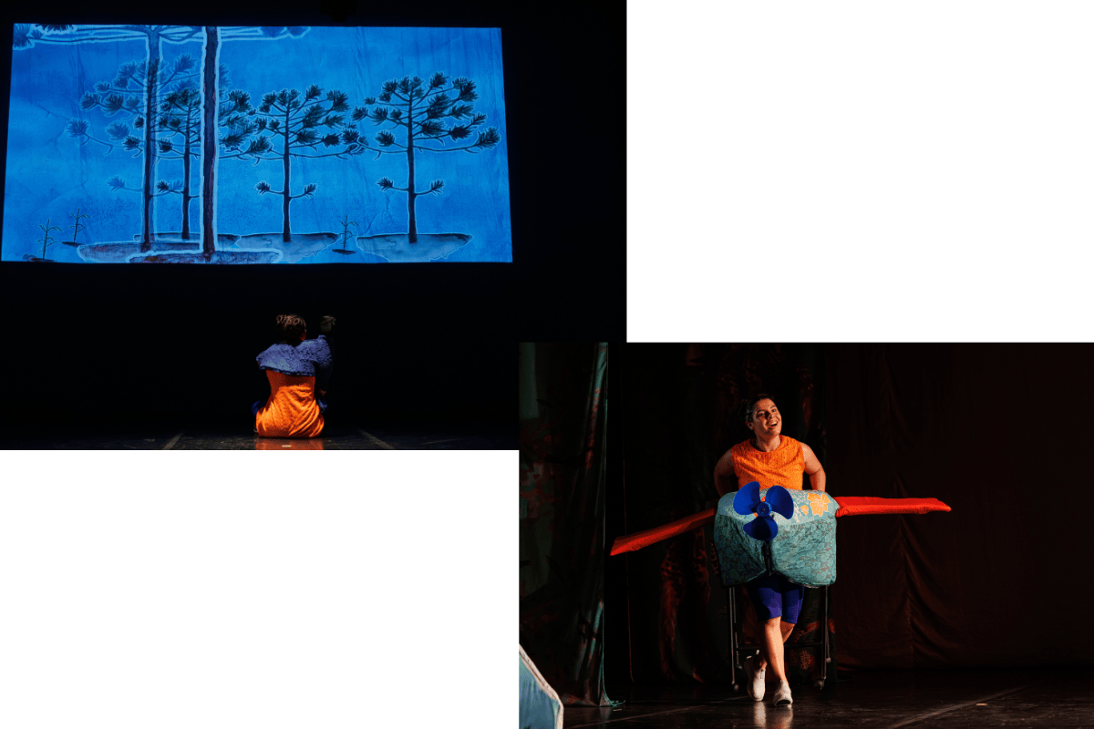 Durante a travessia da personagem principal, o público percorre diferentes paisagens do Paraná, passando pelo litoral, Curitiba, Vila Velha, Cânion do Guartelá e as Cataratas do Iguaçu. O universo cênico é composto por bonecos que representam animais da fauna local, como capivara, guará e mico-leão-de-cara-preta, além de projeções criadas a partir das ilustrações de Márcio Arcoverde.