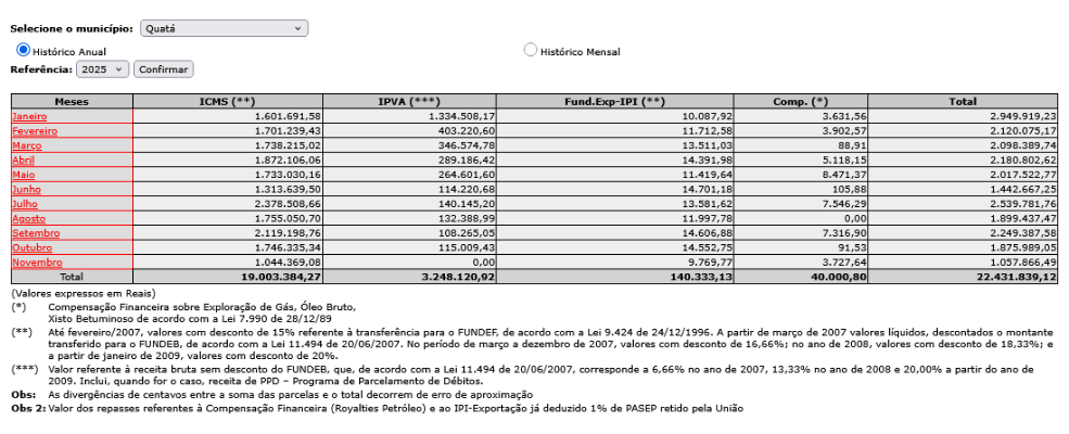 - Novembro – R$ 1.057.866,49 (soma dos três repasses do mês)