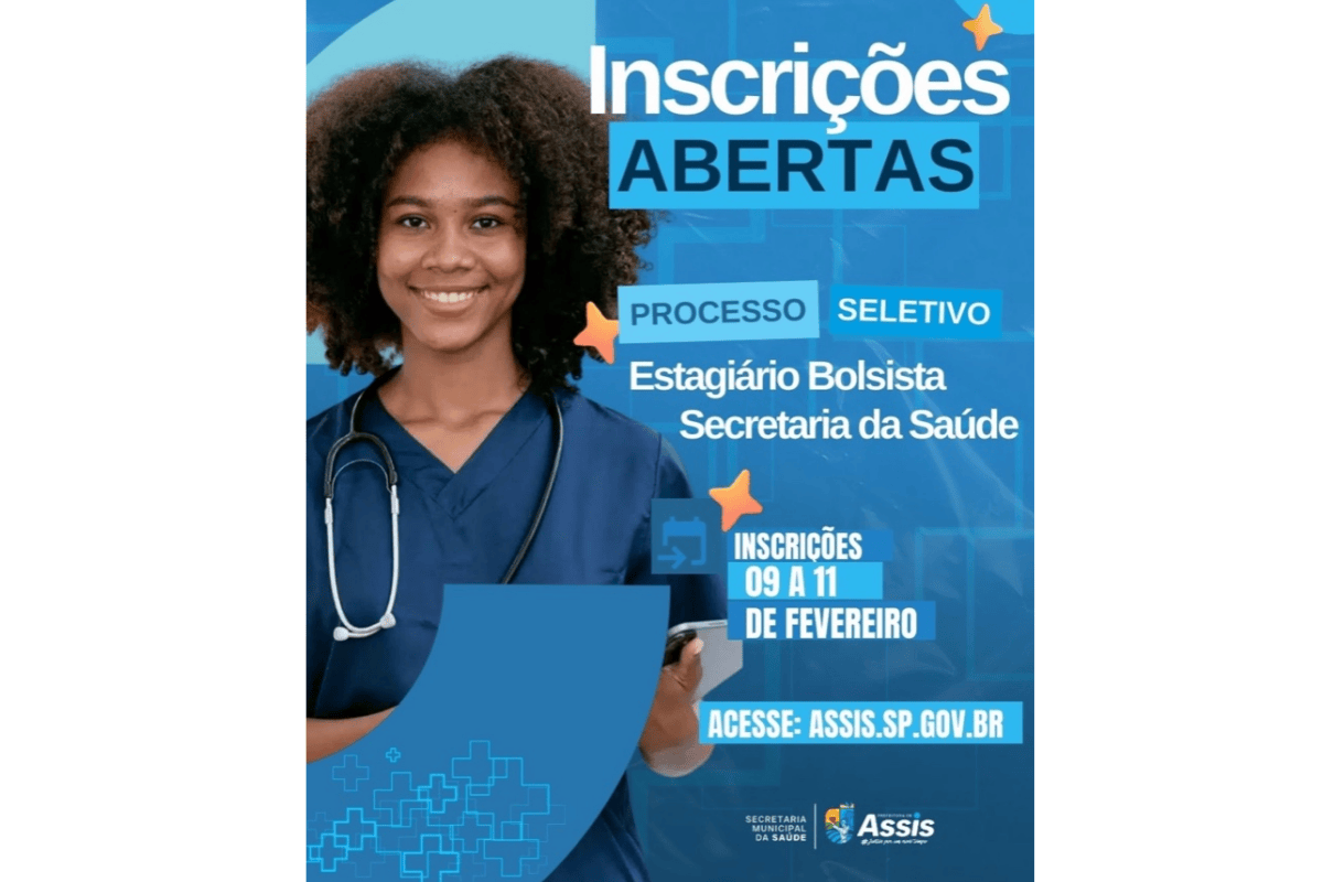 A Prefeitura de Assis, por meio da Secretaria Municipal da Saúde, abriu um Processo Seletivo Simplificado para contratação de estagiários bolsistas da área da saúde. As inscrições estão abertas nos dias 9, 10 e 11 de fevereiro de 2026 e devem ser realizadas exclusivamente de forma online, pelo site oficial do município.
