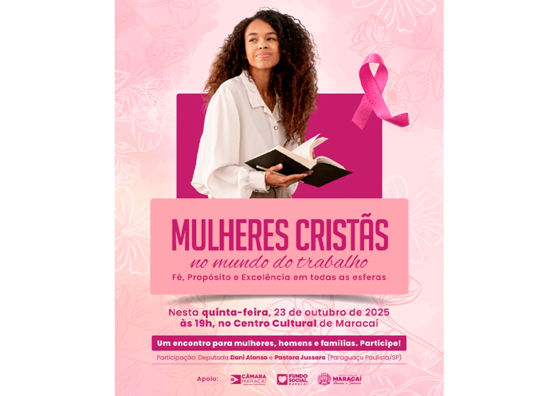 Nesta quinta-feira, 23 de outubro de 2025, às 19h, o Centro Cultural de Maracaí sedia o evento “Mulheres Cristãs no Mundo do Trabalho”, uma noite de reflexão e inspiração voltada à valorização da mulher em suas diversas esferas de atuação.