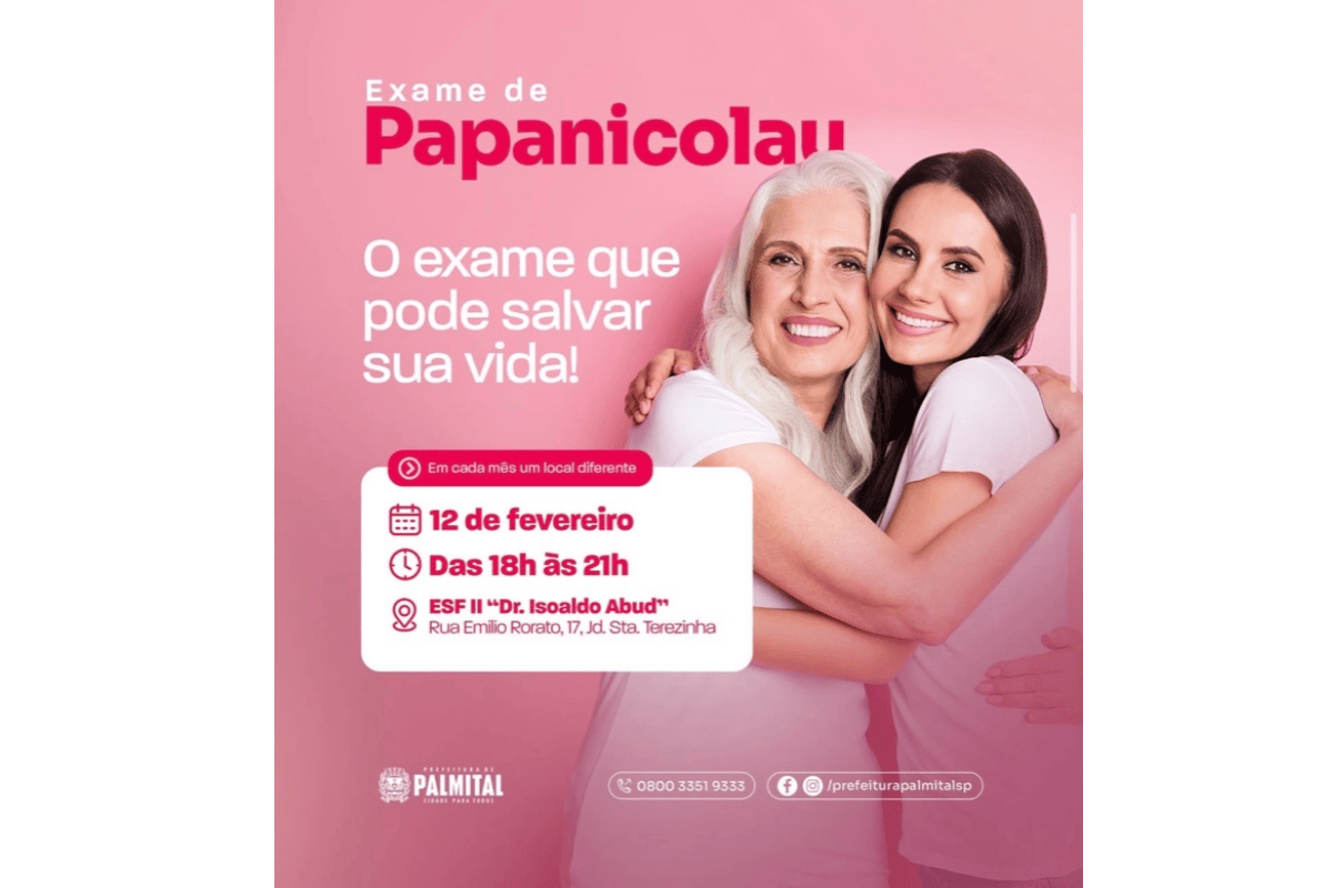 A Prefeitura de Palmital realiza nesta quinta-feira, dia 12 de fevereiro, mais uma ação de saúde preventiva com a oferta do exame de Papanicolau em horário noturno, das 18h às 21h, na ESF II Dr. Isoaldo Abud, localizada na Rua Emílio Rorato, 17, no Jardim Santa Terezinha. A iniciativa busca facilitar o acesso de mulheres que têm dificuldade de comparecer às unidades durante o horário comercial.
