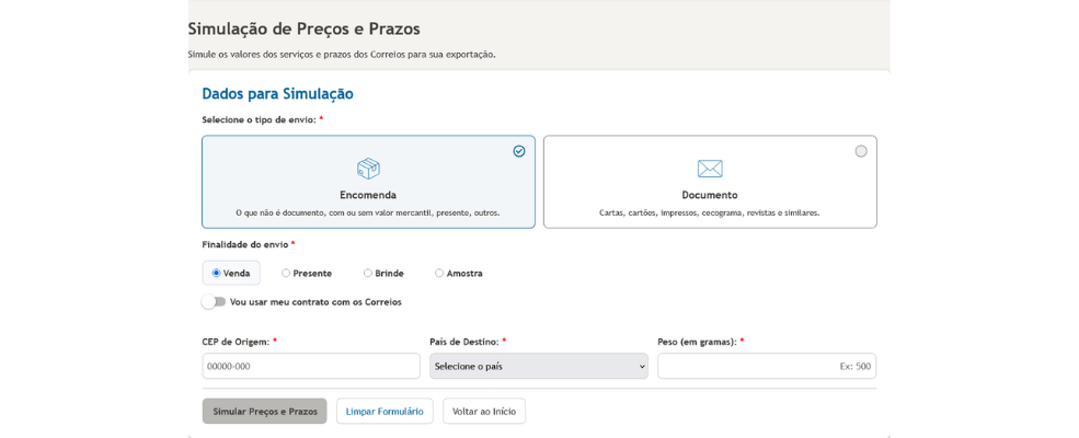 Plataforma oferece a opção de simulação para facilitar a previsão de valores dos envios