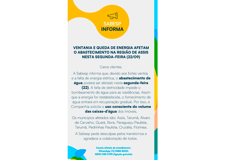 Moradores de Assis enfrentam nesta terça-feira, 23 de setembro, falta de água em diversos bairros da cidade após a forte tempestade de terra e chuva que atingiu a região na segunda-feira, 22. A situação está ligada também à queda de energia elétrica registrada em diferentes pontos da cidade, que afetou o funcionamento das bombas responsáveis pelo abastecimento.