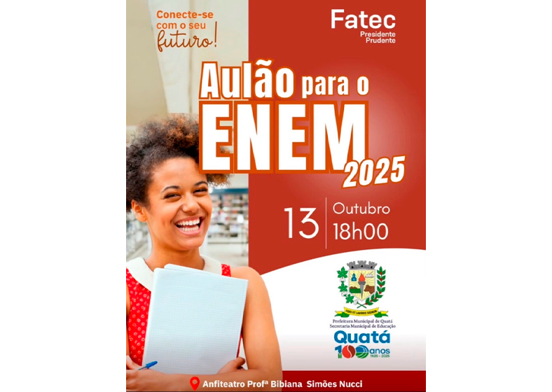 A Prefeitura de Quatá, em parceria com a Fatec de Presidente Prudente, realiza nesta segunda-feira, 13 de outubro, um aulão preparatório gratuito para o Enem 2025, aberto a estudantes e à comunidade em geral. A atividade acontece no Anfiteatro Professora Bibiana Simões Nucci, a partir das 18h.