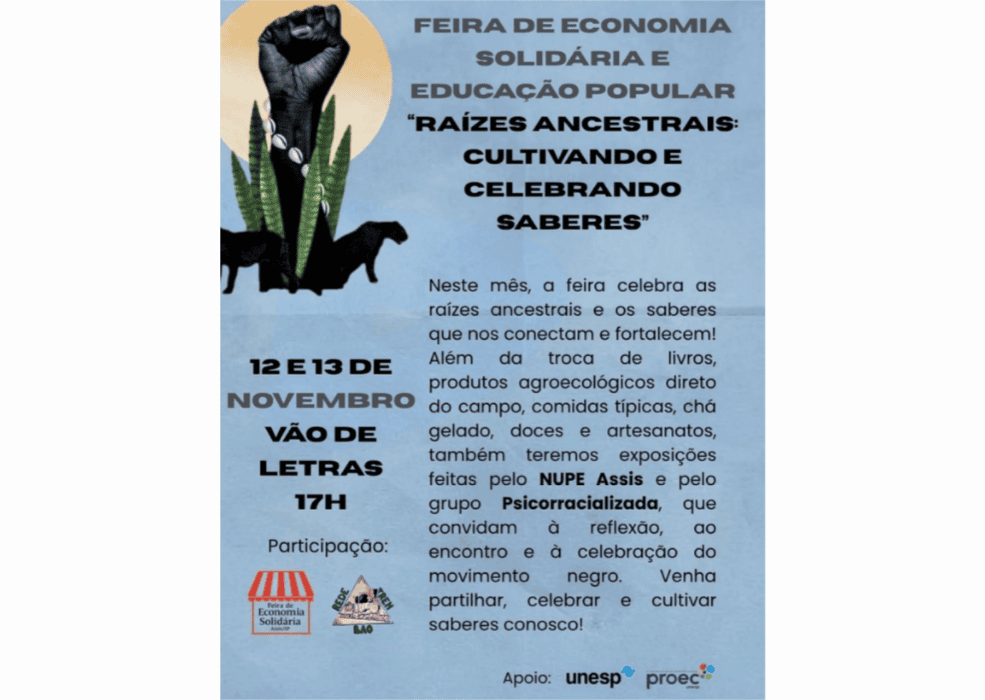 A Feira de Economia Solidária e Educação Popular da UNESP realiza nesta quarta e quinta-feira, dias 12 e 13 de novembro, a edição especial “Raízes Ancestrais: cultivando e celebrando saberes”, dedicada à valorização da cultura afro-brasileira, à troca de conhecimentos e ao fortalecimento das redes solidárias e comunitárias.