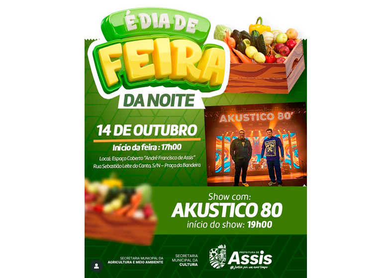 A tradicional Feira da Noite de Assis acontece nesta terça-feira, 14 de outubro, a partir das 17h, no Espaço Coberto “André Francisco de Assis”, localizado na Praça da Bandeira. Esta é a segunda edição no novo endereço, que substitui o antigo ponto próximo ao terminal rodoviário e oferece melhor estrutura e conforto aos visitantes e feirantes.