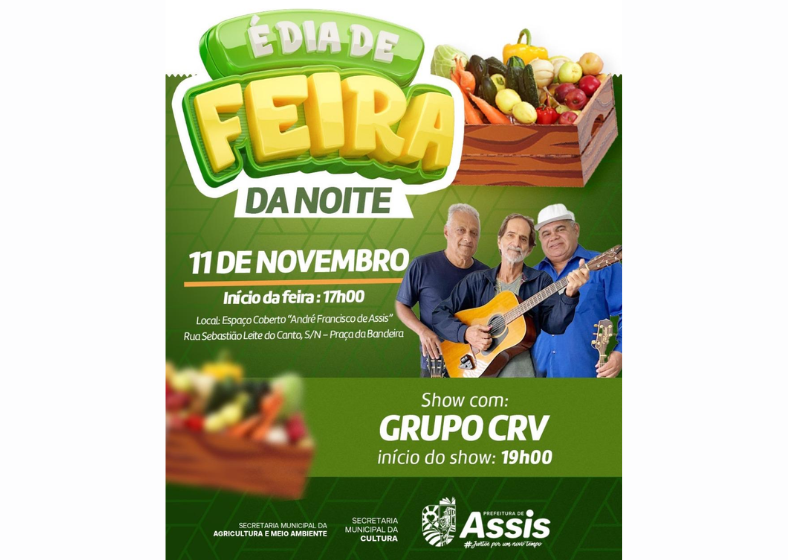 A tradicional Feira da Noite de Assis acontece nesta terça-feira, 11 de novembro, no Espaço Coberto, na Praça da Bandeira, a partir das 17h. O evento reúne agricultores e empreendedores locais em uma noite de lazer, cultura e sabor.