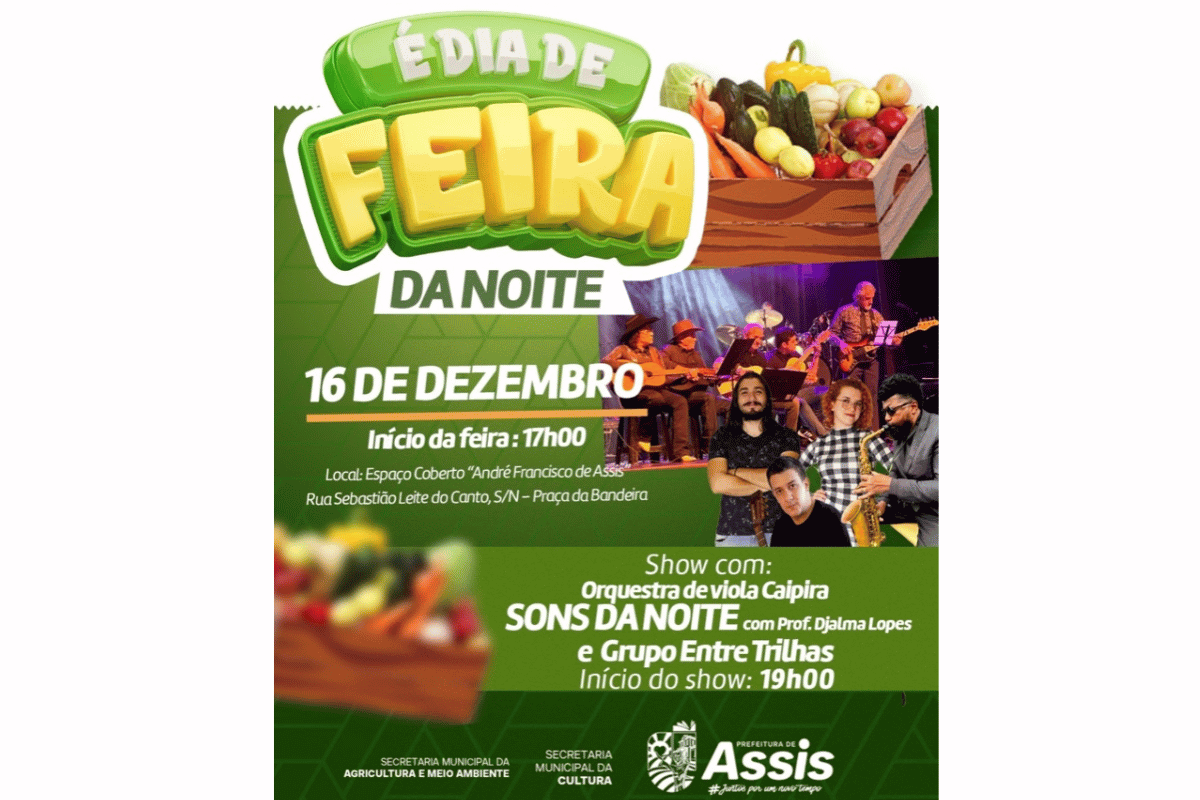 A Feira da Noite será realizada nesta terça-feira, 16 de dezembro, em Assis, a partir das 17h, no Espaço Coberto André Francisco de Assis, na Praça da Bandeira. A programação prevê feira com produtos e alimentação e, às 19h, apresentação musical com a Orquestra de Viola Caipira “Sons da Noite”, com o professor Djalma Lopes, e o Grupo Entre Trilhas.