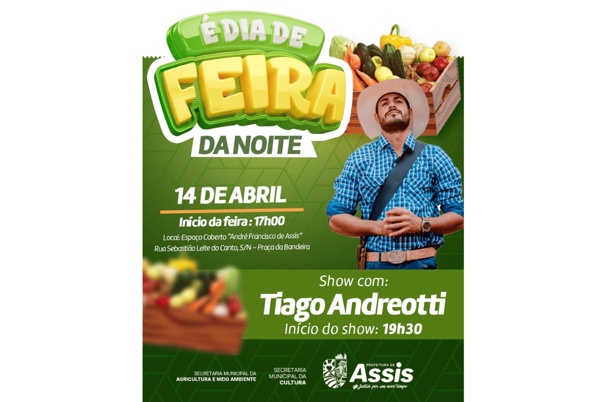 A tradicional Feira da Noite será realizada nesta terça-feira, 14 de abril, em Assis, reunindo produtores locais, opções gastronômicas e programação cultural no Espaço Coberto “André Francisco de Assis”, na Praça da Bandeira. O evento tem início às 17h e é aberto ao público.