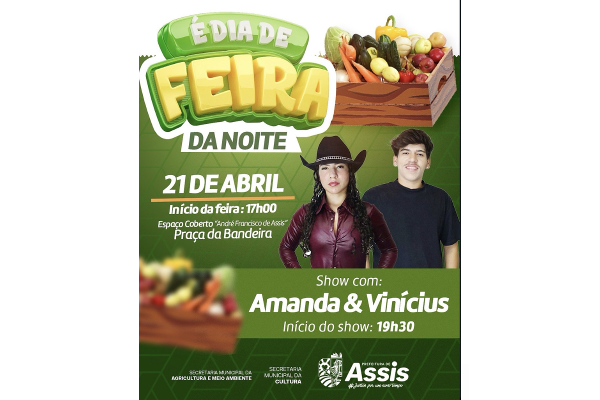 A tradicional Feira da Noite de Assis será realizada nesta terça-feira, 21 de abril, feriado de Tiradentes, reunindo gastronomia, produtos hortifrutigranjeiros e programação cultural no Espaço Coberto “André Francisco de Assis”, na Praça da Bandeira. A feira começa às 17h, com show ao vivo da dupla Amanda & Vinícius a partir das 19h30.