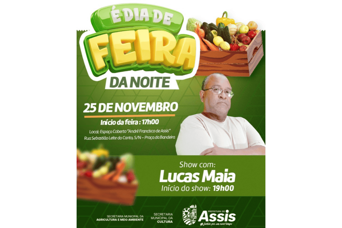 A Feira da Noite de Assis acontece nesta terça-feira, 25 de novembro, no Espaço Coberto André Francisco de Assis, na Praça da Bandeira. A programação começa às 17h e segue durante a noite com oferta de produtos frescos, artesanato e música ao vivo, garantindo um ambiente de convivência familiar.