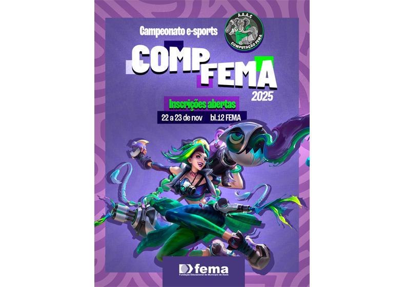 A Fundação Educacional do Município de Assis (FEMA) promove, nos dias 22 e 23 de novembro de 2025, a segunda edição do Campeonato de E-Sports, com competições nos jogos Valorant, League of Legends (LoL) e EA Sports FC 25. O evento será realizado no Bloco 12 da instituição, e está com inscrições abertas para jogadores e equipes.