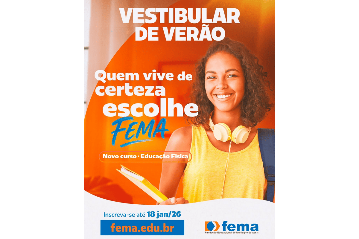 A Fundação Educacional do Município de Assis, a FEMA, está com inscrições abertas para o Vestibular de Verão 2026. O processo seletivo é gratuito, totalmente online e pode ser realizado até o dia 18 de janeiro de 2026, ampliando o acesso ao ensino superior para estudantes de Assis e de toda a região.