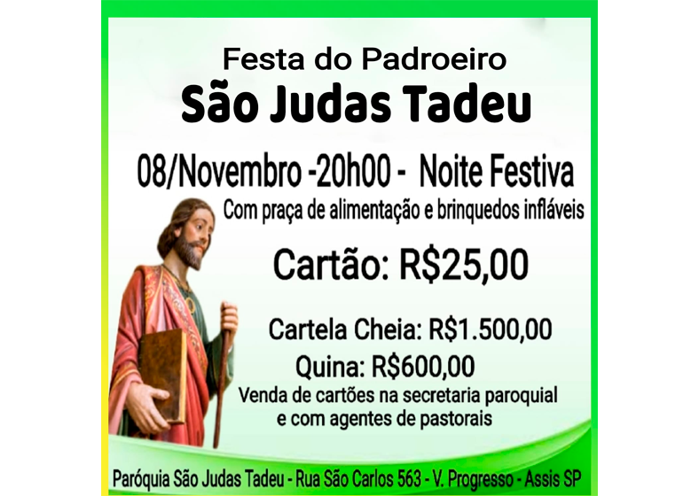 A Paróquia São Judas Tadeu, localizada na Vila Progresso, em Assis, realiza no próximo dia 8 de novembro, a tradicional Festa do Padroeiro São Judas Tadeu. O evento começa às 20h e promete uma noite de confraternização, música e diversão para toda a comunidade.