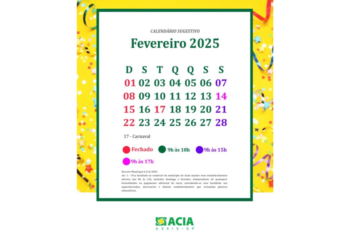 O comércio de Assis já tem definido o calendário sugestivo de funcionamento para fevereiro de 2026. A Associação Comercial e Industrial de Assis (ACIA) divulgou o cronograma com os horários recomendados para os estabelecimentos ao longo do mês, incluindo dias de expediente ampliado, funcionamento aos sábados e o fechamento no feriado de Carnaval.