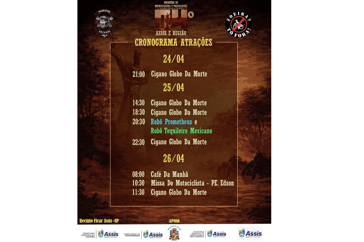A agenda foi organizada com horários distintos em cada dia e busca reunir motociclistas, triciclistas e público em geral em um fim de semana de convivência e entretenimento. O encontro também conta com apoio de setores da Prefeitura de Assis.