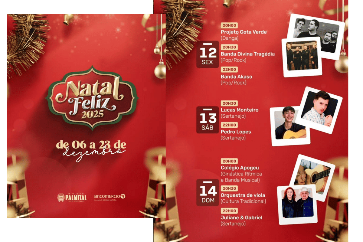 A Prefeitura de Palmital mantém a programação do Natal Feliz 2025, que segue até o dia 23 de dezembro com apresentações culturais na Praça Matriz. Neste final de semana, a cidade volta a receber shows de música, dança e manifestações tradicionais, sempre a partir das 20h, com entrada gratuita e classificação livre.