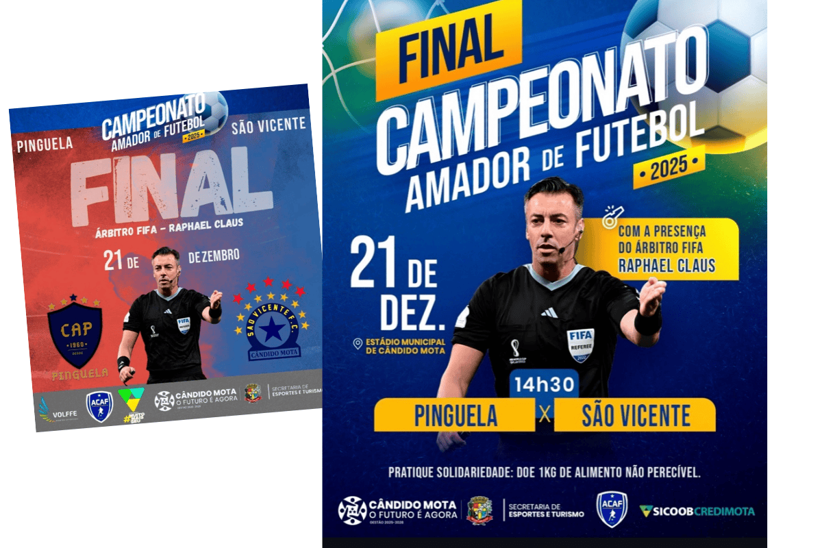A final do Campeonato Amador de Futebol de Cândido Mota será disputada neste domingo, dia 21 de dezembro, às 14h30, no Estádio Municipal Benito Pires, e contará com a presença do árbitro FIFA Raphael Claus, um dos principais nomes da arbitragem brasileira e internacional. A decisão coloca frente a frente as equipes de Pinguela e São Vicente e marca o encerramento da temporada 2025 da competição.