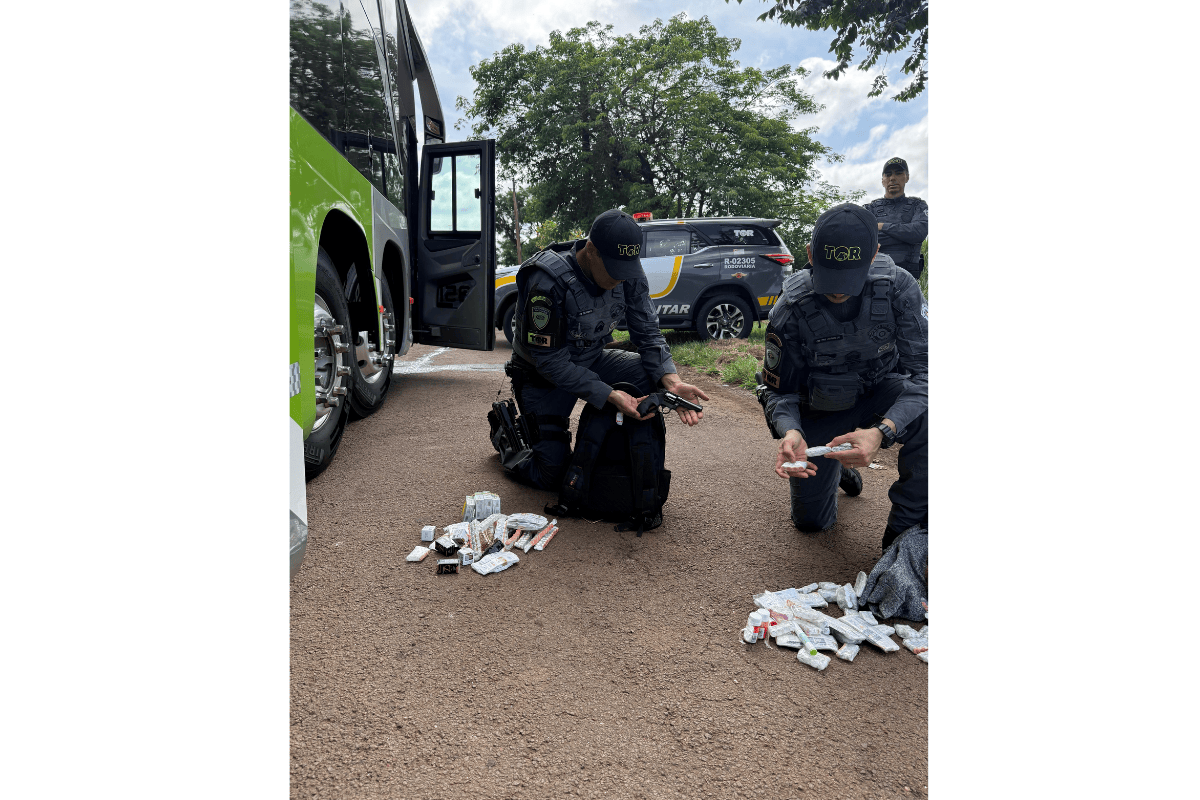 A equipe abordou um ônibus de linha regular que fazia o itinerário Foz do Iguaçu, no Paraná, com destino à capital paulista. Durante a vistoria no interior do veículo, os policiais localizaram grande quantidade de medicamentos e anabolizantes em bagagens pertencentes a dois passageiros, além de uma arma de fogo.