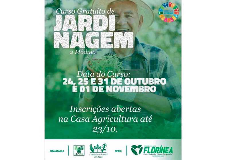 A Prefeitura de Florínea, em parceria com o SENAR e o Sindicato Rural de Assis, está com inscrições abertas até quinta-feira, 23 de outubro, para o 2º módulo do curso gratuito de Jardinagem, que será realizado na Casa da Agricultura.