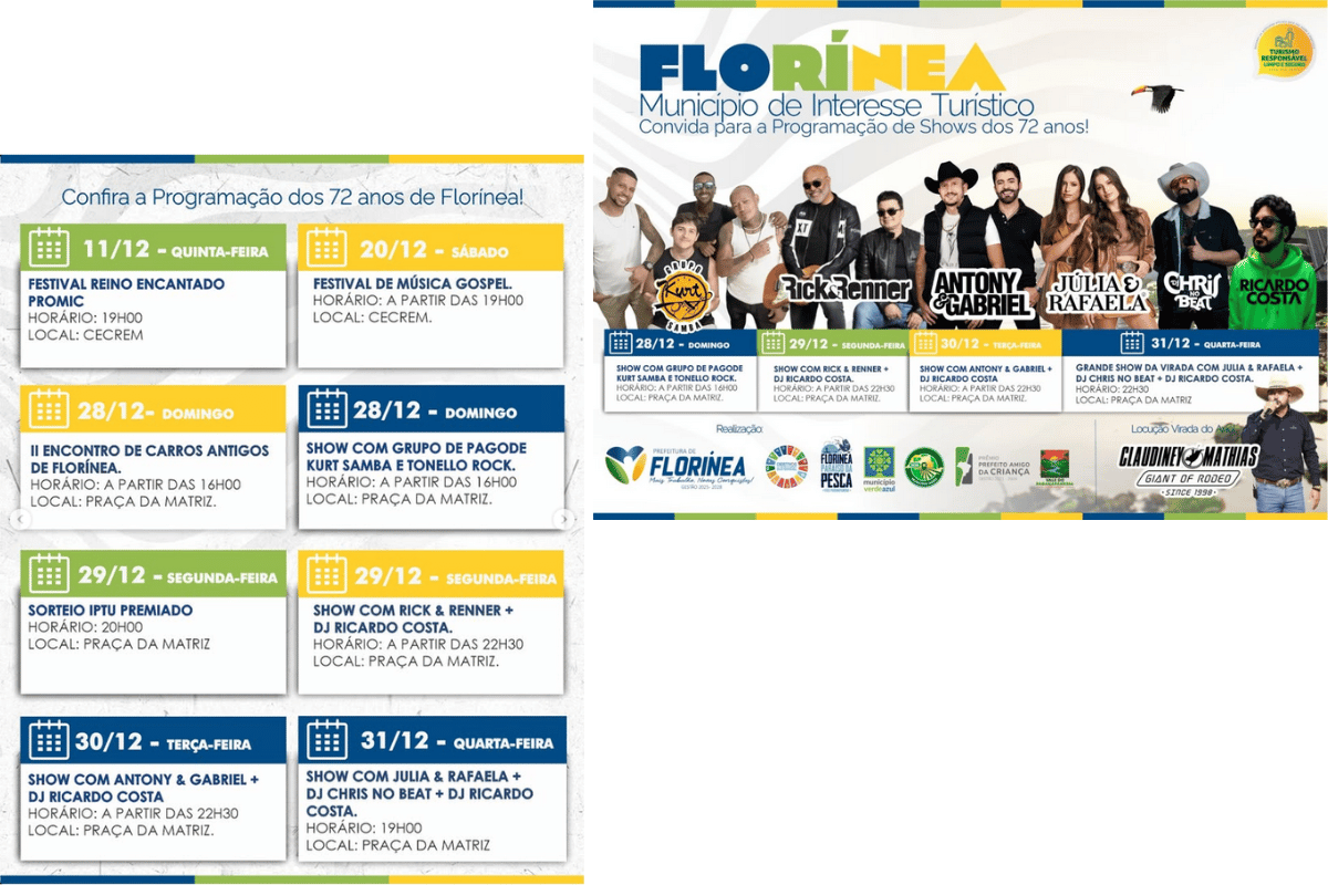 Com eventos que integram música, cultura, esporte e participação comunitária, Florínea reforça sua vocação turística e o compromisso de fomentar atividades que movimentam o comércio, valorizam artistas locais e fortalecem o sentimento de pertencimento.