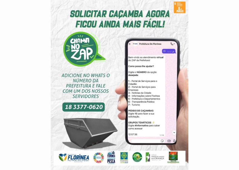 A Prefeitura de Florínea anunciou na última terça-feira, 30 de setembro, a implantação de um novo serviço digital para a população. Agora, os pedidos de caçamba podem ser feitos diretamente pelo WhatsApp, em um processo simples, rápido e prático, que promete reduzir a burocracia e dar mais comodidade aos moradores.