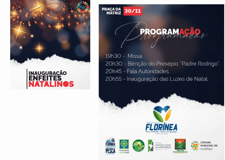 A Prefeitura de Florínea anunciou a programação oficial para a inauguração dos enfeites natalinos de 2025, que ocorrerá no domingo, dia 30 de novembro, na Praça da Matriz. A celebração marca o início das festividades de fim de ano no município e contará com apresentações religiosas e participação de autoridades.