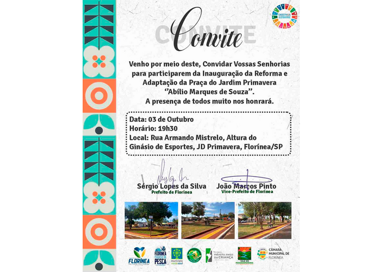 A Prefeitura de Florínea realiza nesta sexta-feira, 3 de outubro, a inauguração da reforma e adaptação da Praça do Jardim Primavera, que leva o nome de “Abílio Marques de Souza”. A cerimônia está marcada para as 19h30, na Rua Armando Mistrelo, nas proximidades do Ginásio de Esportes.